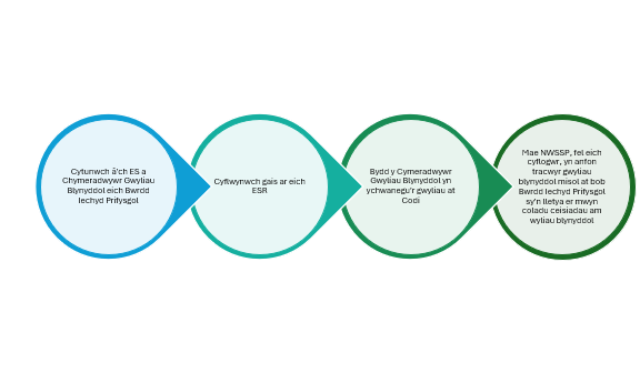 Fel un o weithwyr NWSSP, bydd gennych fynediad at Gofnod Staff Electronig (ESR). Dyma ble bydd yr Un Cyflogwr Arweiniol yn cofnodi absenoldebau a gwyliau arbennig ar ran sefydliadau sy’n lletya. Bydd eich cyfrinair ESR yn cael ei anfon i’ch cyfeiriad e-bost GIG Cymru. Mae NWSSP yn gweithredu system slipiau cyflog di-bapur felly bydd slipiau cyflog ar gael i’w gweld a’u lawrlwytho o’r ESR. Cadwch eich gwybodaeth bersonol yn gyfredol ar ESR gan ein bod yn dibynnu ar y wybodaeth hon os bydd angen i ni gysylltu â chi am unrhyw reswm. Os oes gennych chi unrhyw ymholiadau ynglŷn â’ch cyfrif ESR, cysylltwch â Hyb Cymorth ESR yn esrhub.wales@wales.nhs.uk.