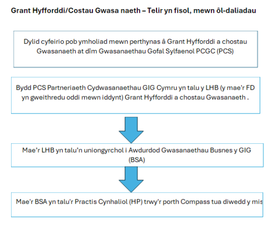 Mae’r diagram canlynol yn dangos llif y taliadau hyn i’r Practis sy'n Lletya