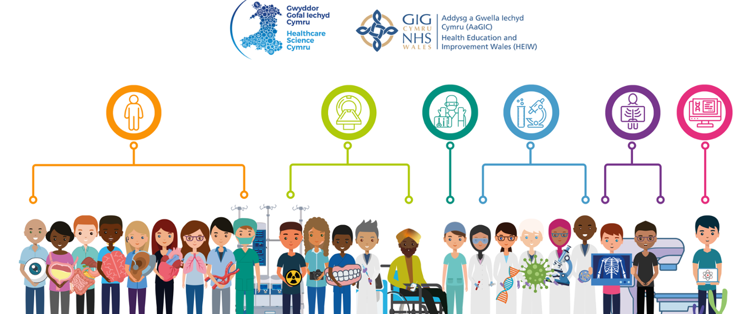 Mae ein poster yn darparu canllaw gweledol defnyddiol i'r proffesiynau gwyddor gofal iechyd yn GIG Cymru.