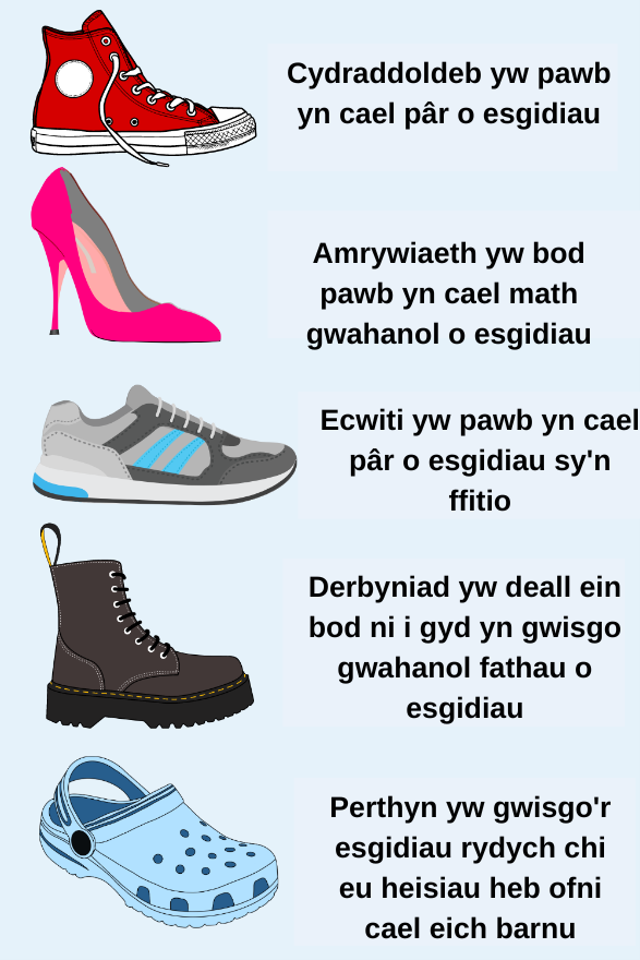 Mae ein gwasanaeth iechyd wedi canolbwyntio ar gydraddoldeb erioed – pawb yn cael yr un peth. Yr hyn rydyn ni wir ei eisiau yw cydraddoldeb – pawb yn cael yr hyn sydd ei angen arnyn nhw. Mae'r gymhariaeth esgidiau wir yn fy helpu i ganolbwyntio ar yr hyn yr ydym yn anelu ato.