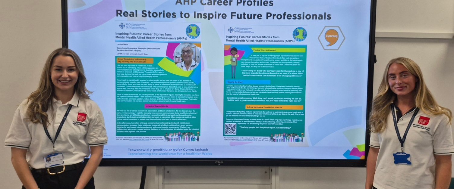 Ar draws GIG Cymru, mae nifer gyson uchel o swyddi gwag heb eu llenwi ar gyfer AHPs ar draws gwasanaethau iechyd meddwl. Er mwyn helpu i fynd i'r afael â hyn, cafodd Carys a Hannah y dasg o greu proffiliau gyrfa ar gyfer platfform Tregyrfa AaGIC, pentref rhithwir sy'n arddangos cyfleoedd ym maes iechyd a gofal cymdeithasol. Nod y proffiliau hyn yw tynnu sylw at yr ystod amrywiol o rolau AHP ym maes iechyd meddwl ac ysbrydoli gweithwyr proffesiynol yn y dyfodol.